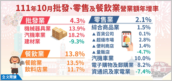10月批發業營業額:批發業1兆642億元,年增4.3%。零售業3,807億元,年增2.1%。餐飲業769億元,年增13.8%